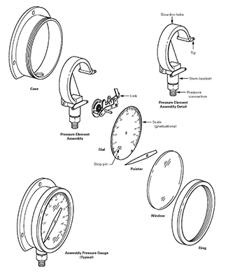 一般压力表通过表内的敏感元件--波登管的弹性形变,经由表内机芯的转换机构将波登管的弹性形变转换为旋转运动,引起指针偏转来显示压力。弹簧官分为C型管、盘簧管、螺旋管等型式。一般采用冷作硬化型材料(材料有铜合金、不锈钢、Monel合金等),在退火状态下具有很高的可塑性,经冷作加工硬化及定性处理后获得很高的弹性和强度。